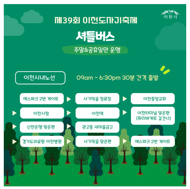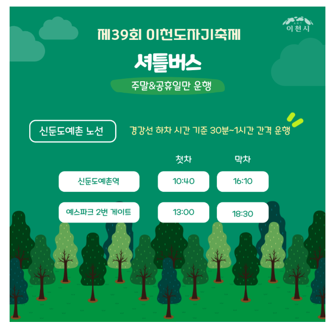 축제 기간 중 주말과 공휴일에는 이천시내 및 전철역을 오가는 셔틀버스가 무료로 운영됩니다.