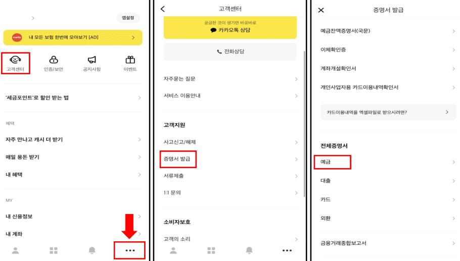 이 중 ‘고객센터’ → ‘증명서 발급’으로 진입하면 됩니다.